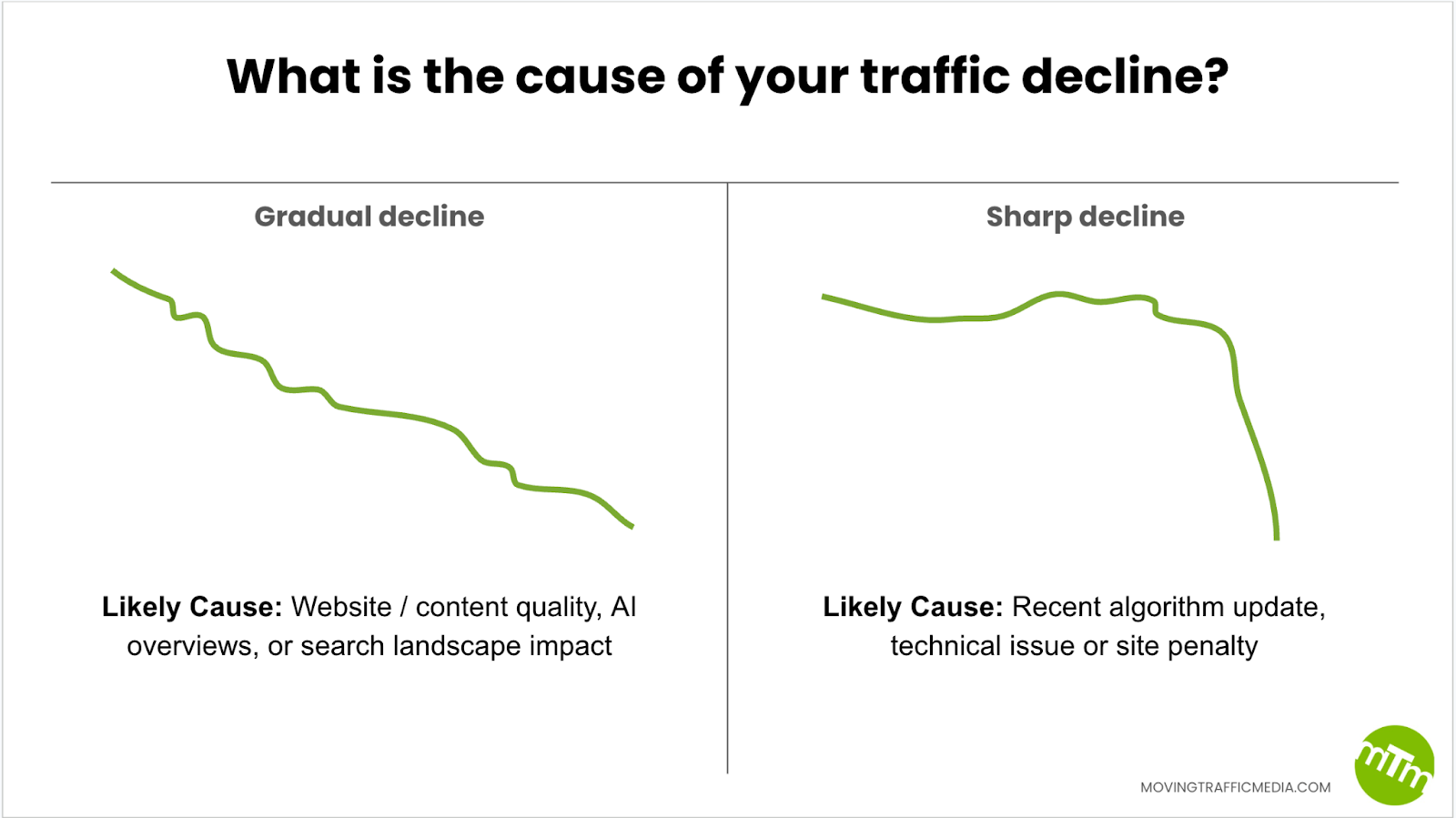 Below are the most common causes of traffic declines and the reasons agencies often struggle to address them efficiently.