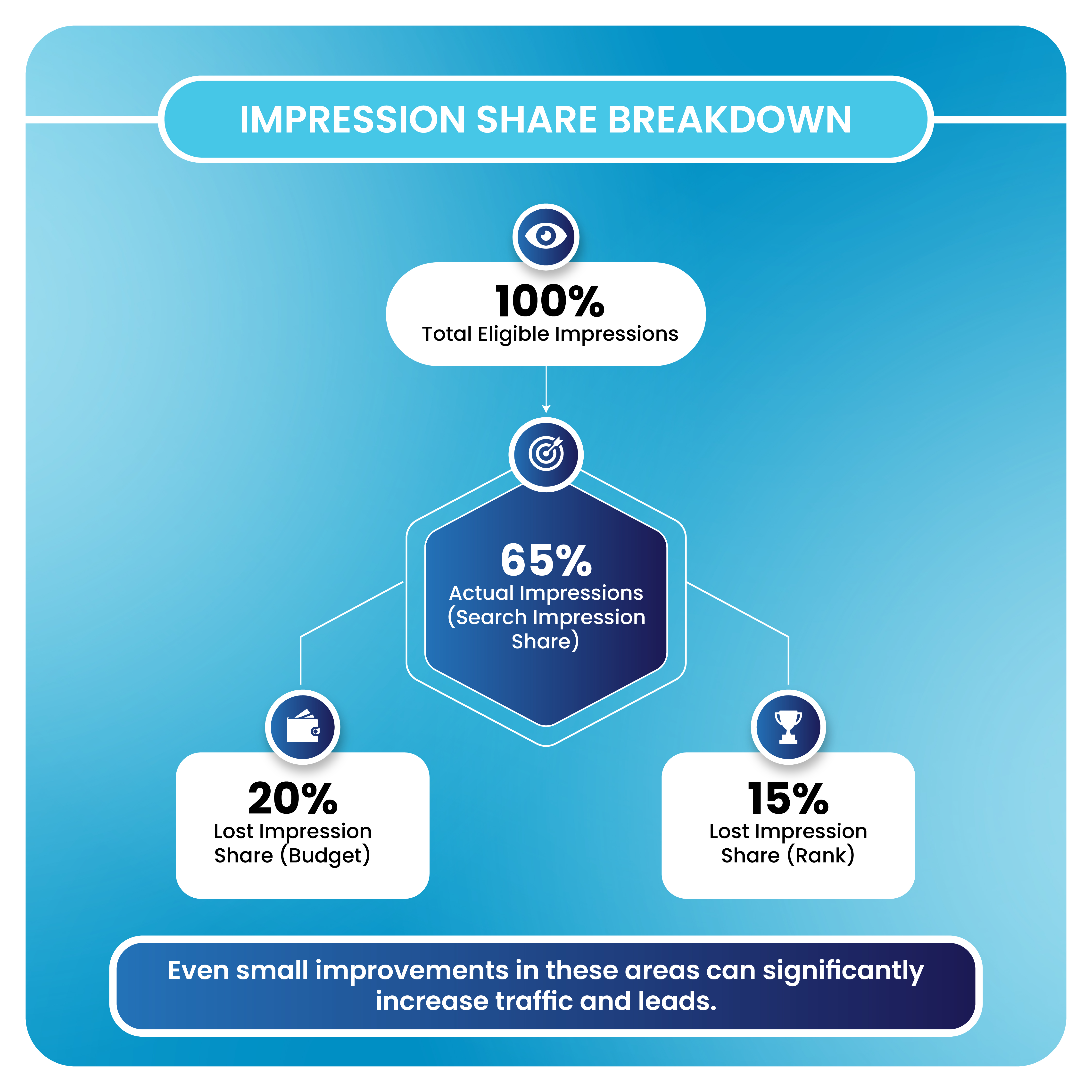 - Higher impression share often translates into increased lead volume because your ads appear more frequently in relevant searches