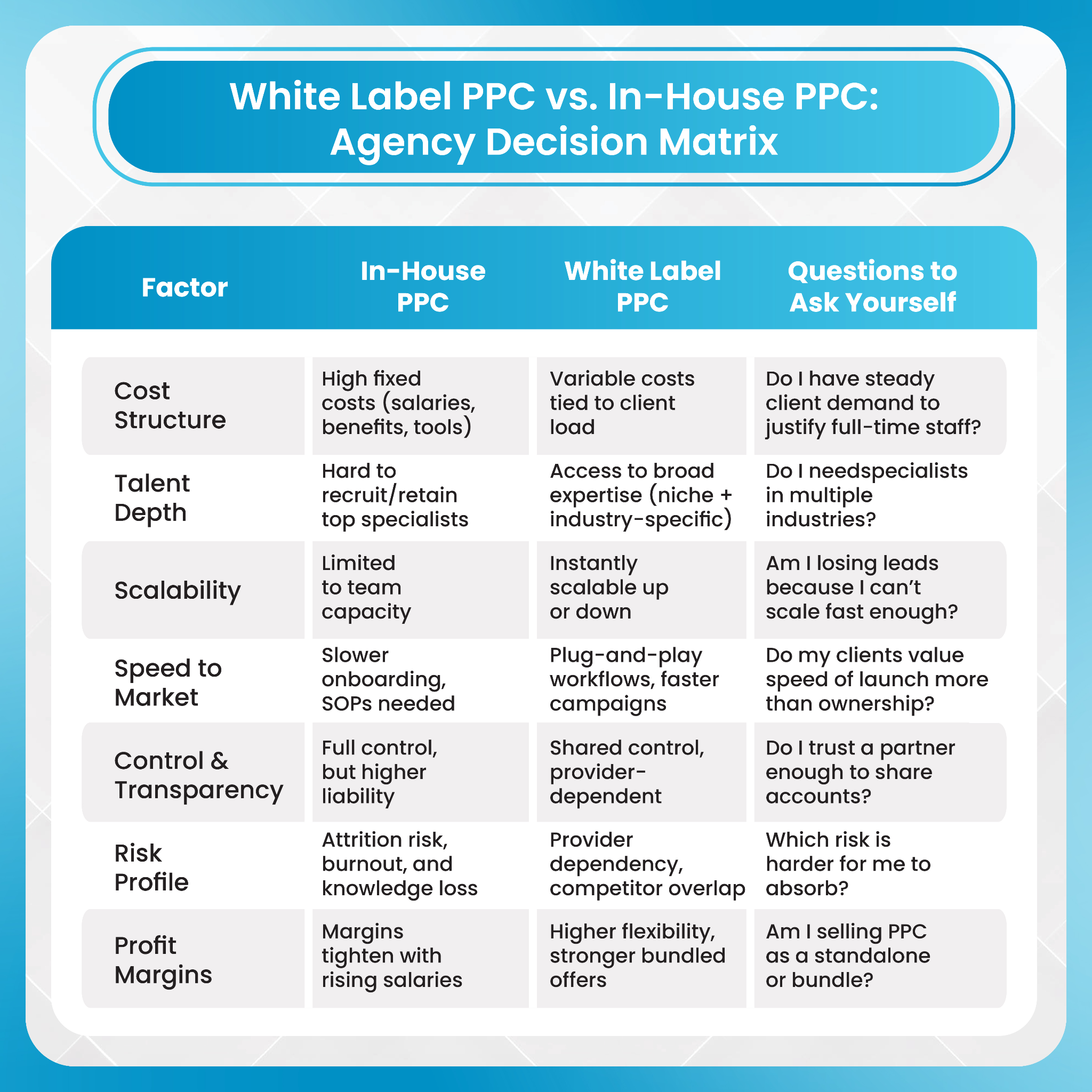 Scenario: An agency with 5 in-house PPC accounts wants to scale to 20. Hiring additional staff could double overhead. With a provider, the agency simply pays per campaign, protecting margins while serving more clients.