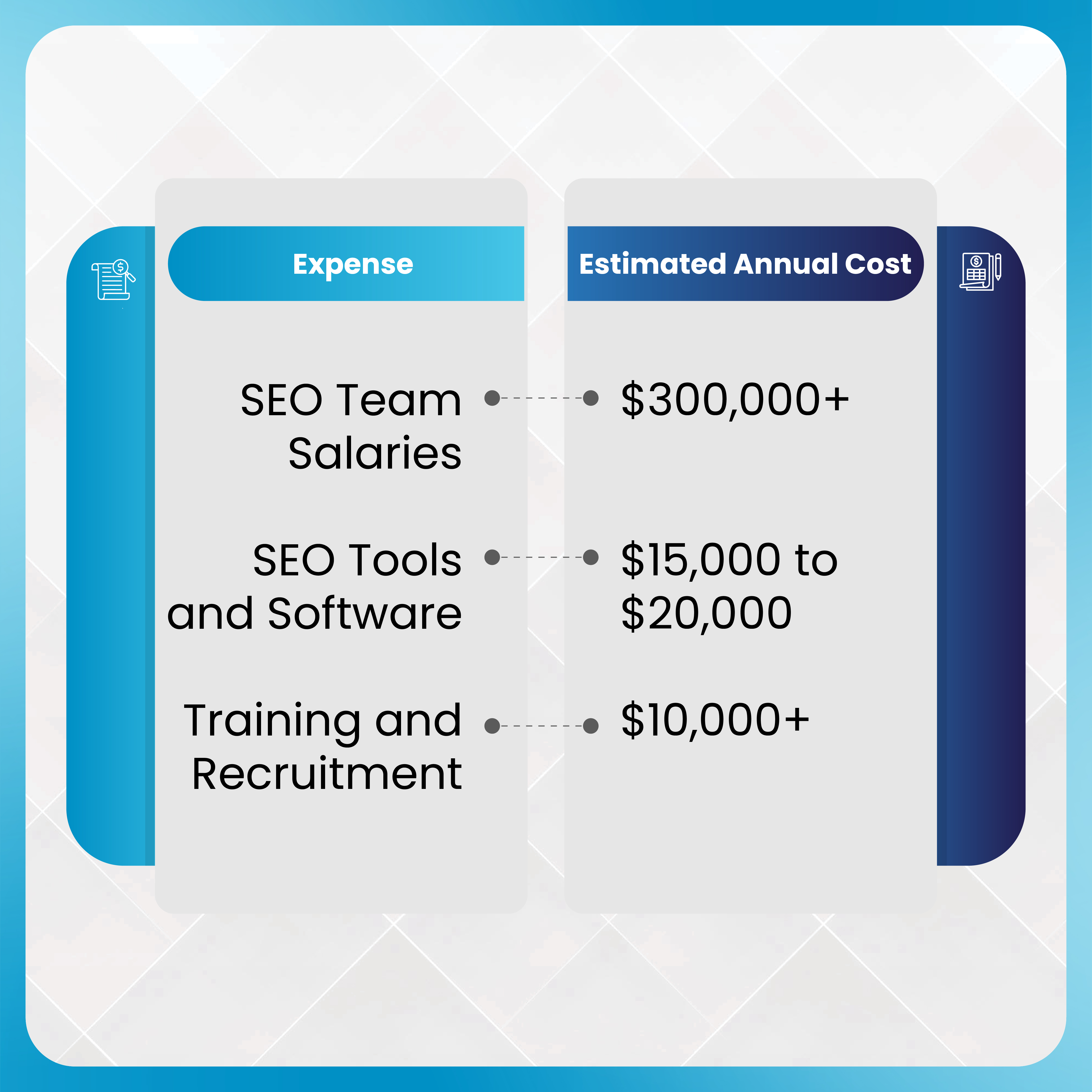 Hiring these professionals can be expensive. A mid-sized agency building an internal SEO team may face costs like the following: