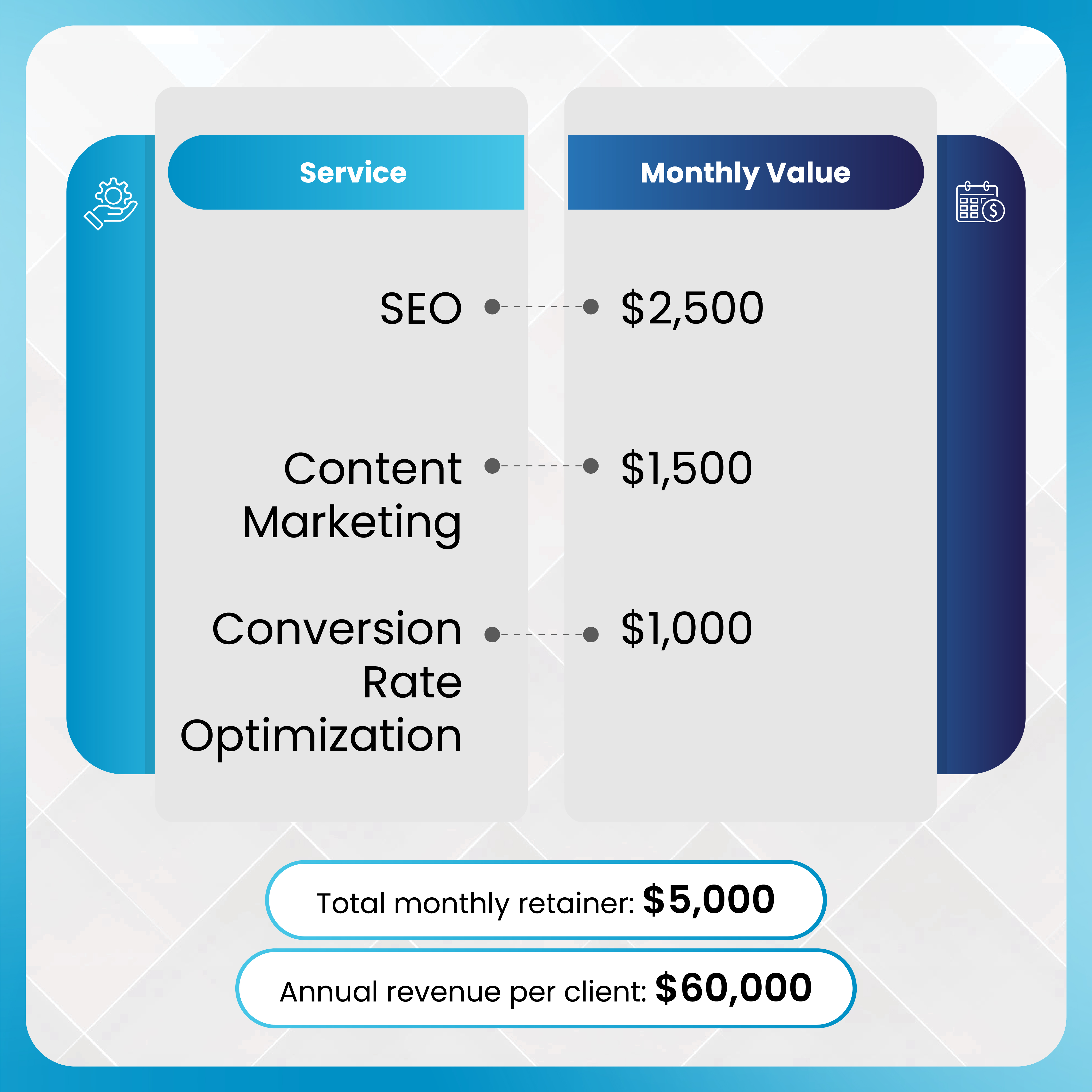 Total revenue from a single client: $2,500 × 36 = $90,000
